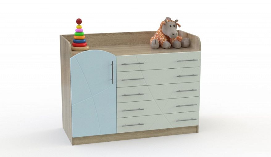 Детский комод Мая 2 BMS сочетает в себе функции пеленального и бельевого. Универсальная модель с просторной верхней панелью, ограниченной скругленными бортиками, оборудована пятью выдвижными ящиками и распашным отделением с полками для удобного хранения детских вещей. Особенность дизайна комода – фигурный цветной фасад, украшенный оригинальной фрезеровкой и оснащенный ручками-рейлингами. Купить детский комод Мая 2 BMS приглашаем в наш интернет-магазин с выбором фурнитуры и цвета по каталогу.