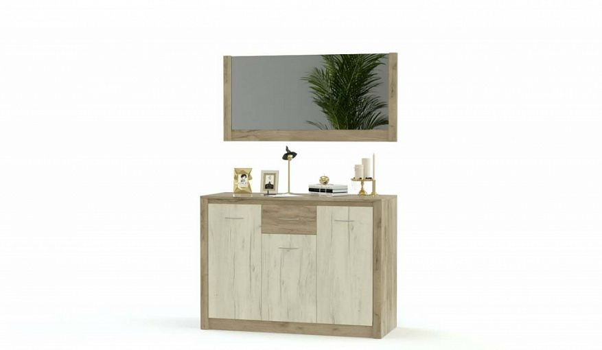 Комод Стелла 1.10 BMS дополнен большим навесным зеркалом в раме и может использоваться в качестве туалетного столика. Комбинированная модель оборудована тремя распашными отделениями, выдвижным ящиком для мелочей и просторной столешницей, на которой смогут разместиться уходовые средства, аксессуары и интерьерные украшения. Фасад комода с декоративными накладками по бокам выполнен в светлых крафтовых тонах. Купить комод Стелла 1.10 BMS вы сможете в нашем интернет-магазине.