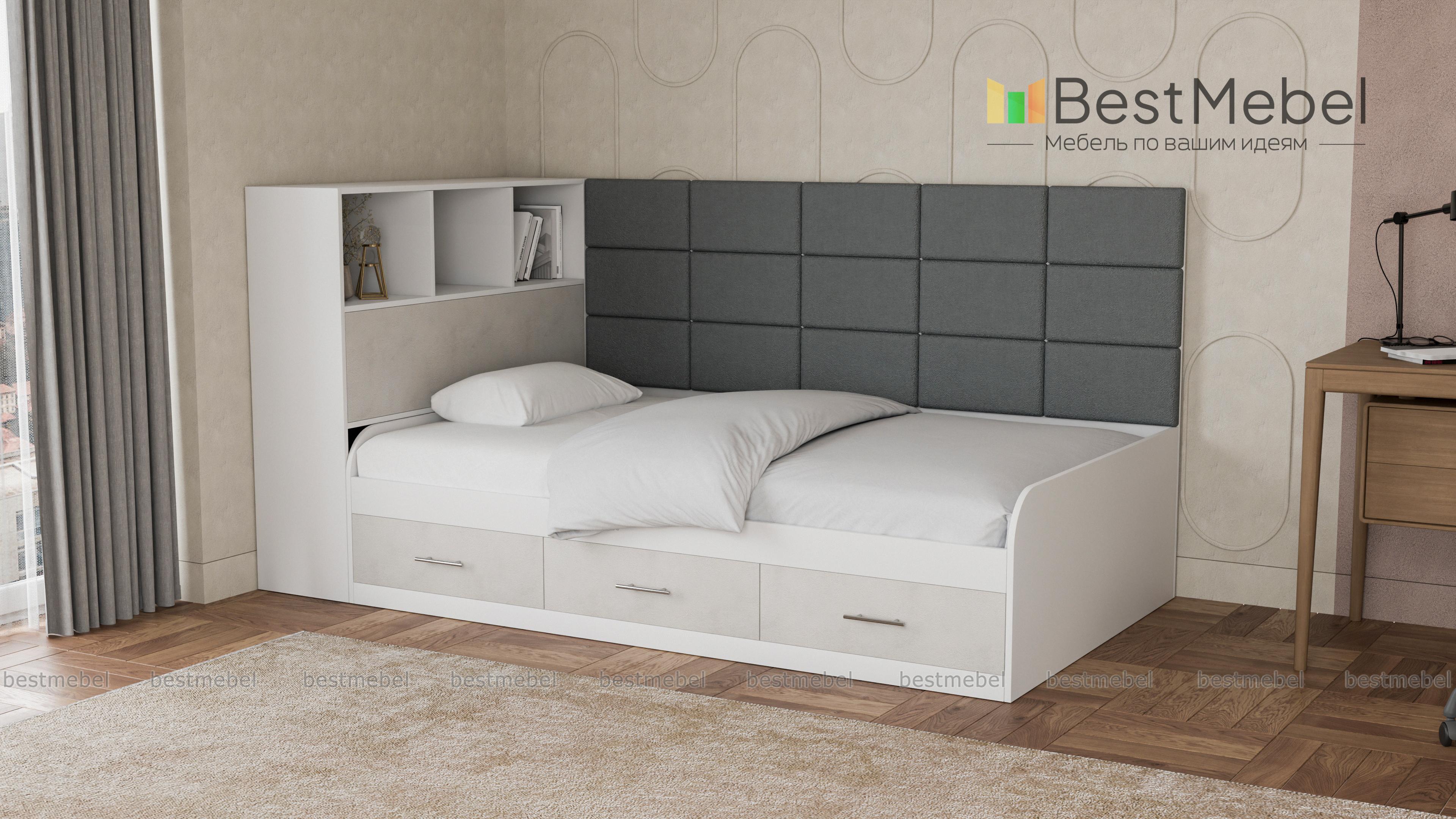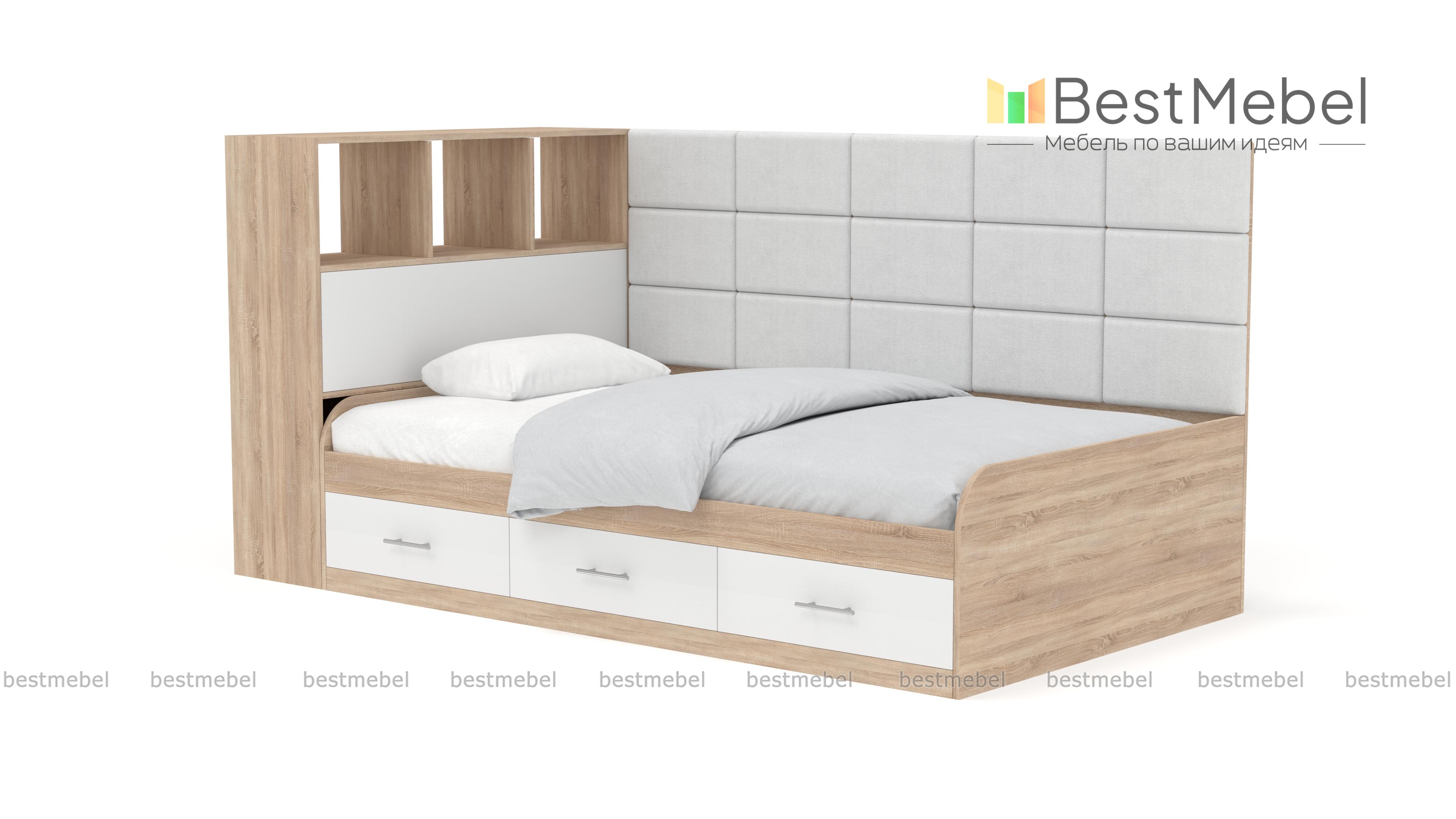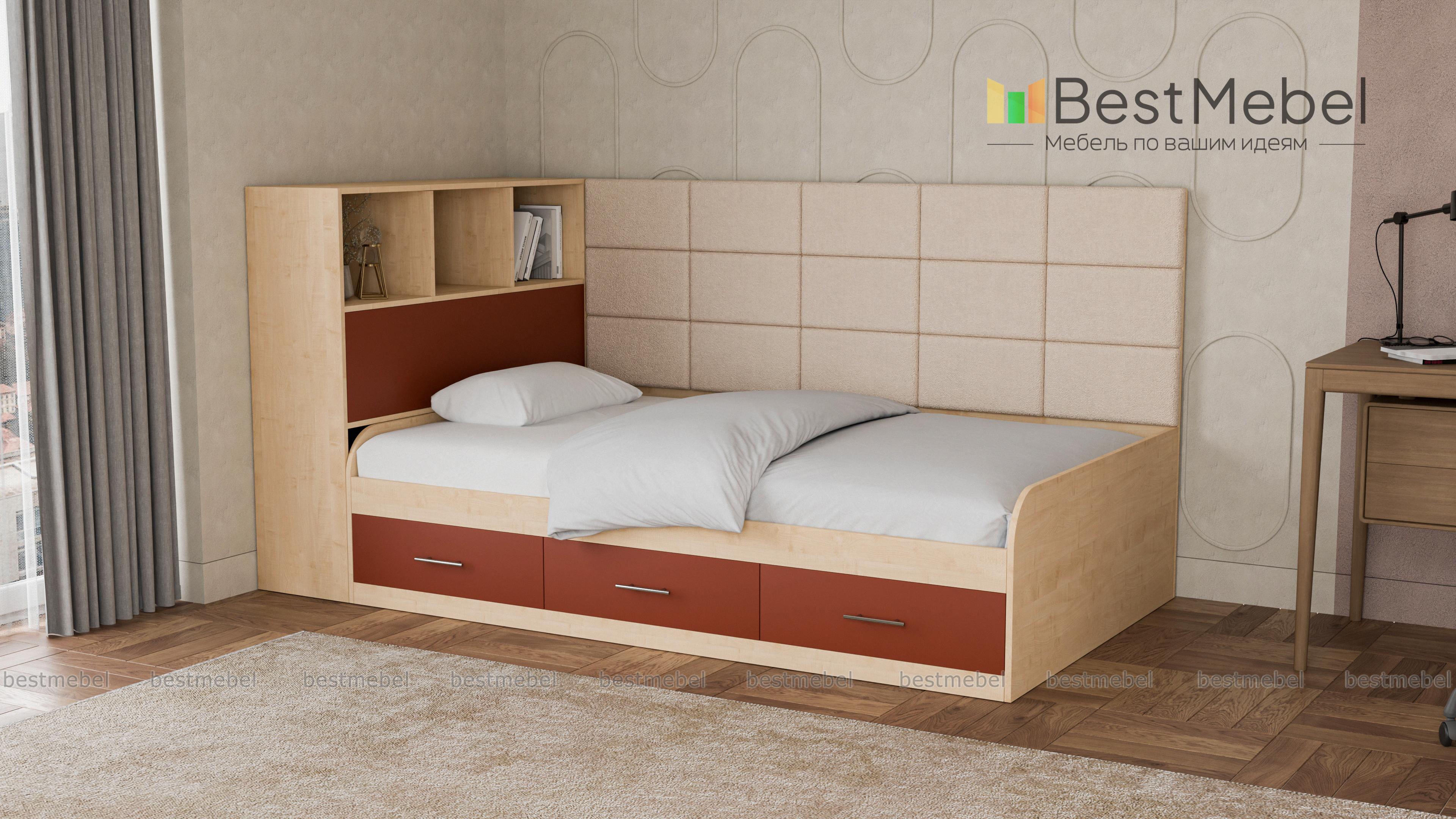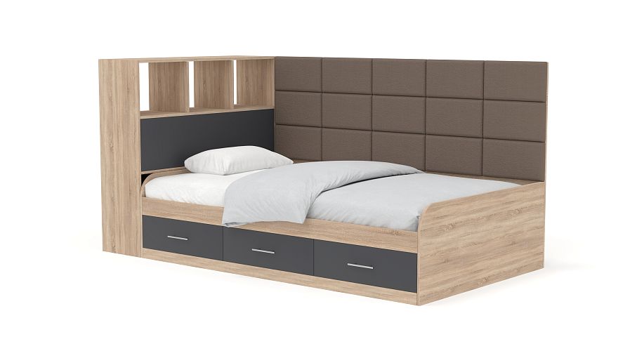 Кровать с 3 ящиками Монти BMS – это практичная тахта, подходящая для дневного отдыха и сна. Отличный вариант для современной детской или подростковой комнаты, модель оборудована просторным спальным местом с высокой спинкой. Для хранения постельных принадлежностей, книг и важных мелочей предусмотрены три выдвижных ящика в основании и встроенные в боковину открытые полки и глухое отделение. Особенно уютный вид кровати придает сочетание корпуса древесных тонов с мягкой обивкой, простроченной квадратами. Купить кровать с 3 ящиками Монти BMS приглашаем в наш интернет-магазин, подобрав цветовое решение.