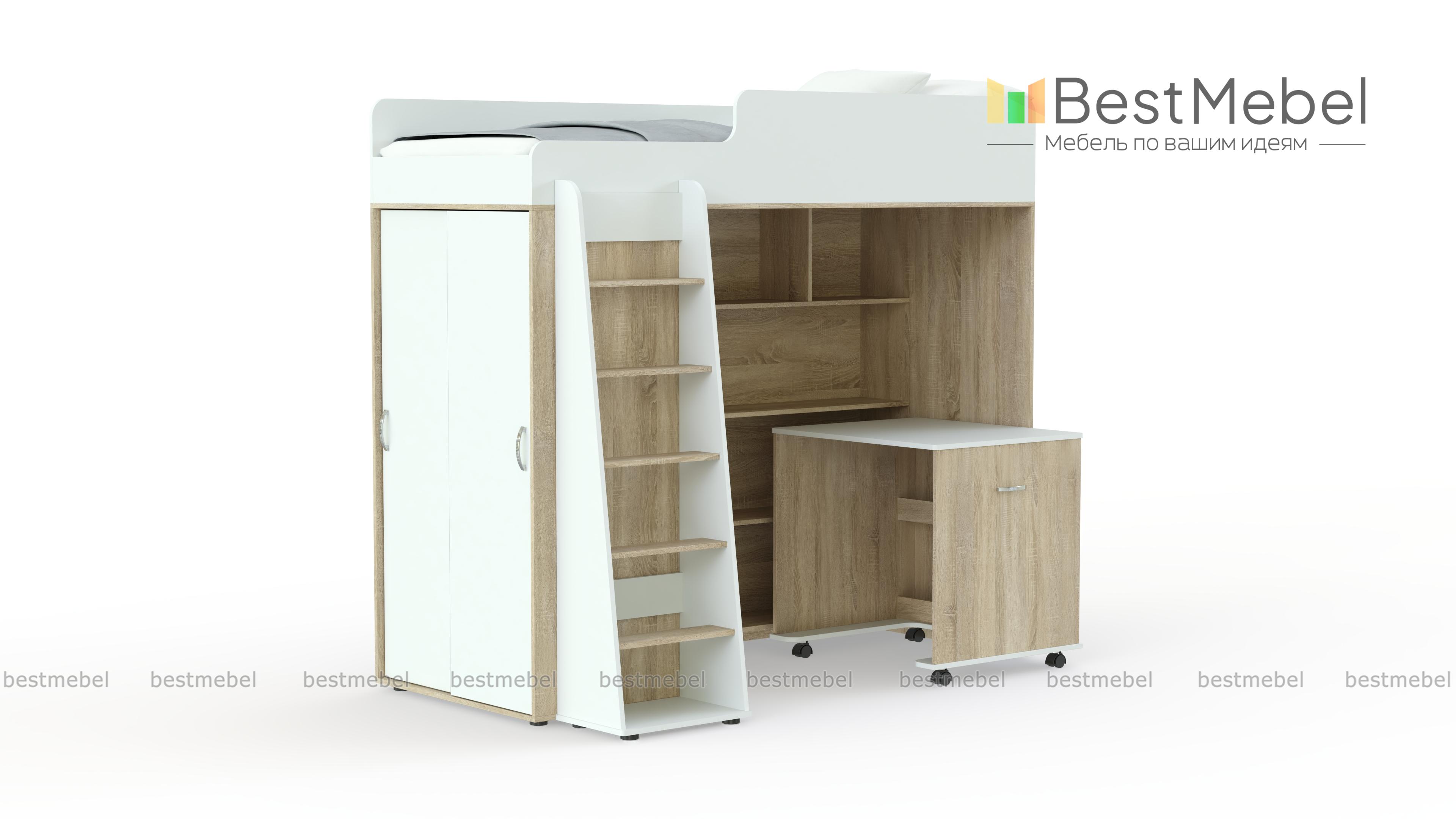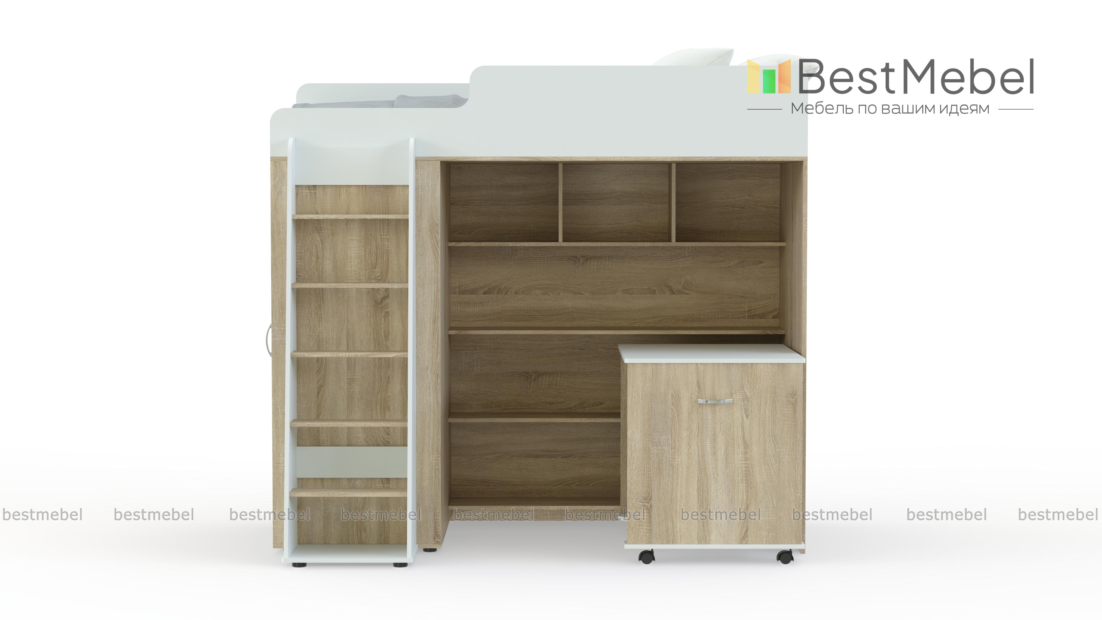 Кровать-чердак Миф-5 BMS представляет собой практичную модульную композицию, незаменимую в малогабаритных помещениях. Спальное место второго яруса оборудовано скругленными защитными бортиками и дополнено приставной устойчивой лестницей. В нише первого яруса располагаются открытые книжные полки и тумба, а с торца разместился шкаф для одежды. Выполненная в сочетании светлых древесных тонов и белых вставок, кровать гармонично дополнит интерьер детской и порадует ребенка. Купить кровать-чердак Миф-5 BMS приглашаем в наш интернет-магазин по отличной цене.