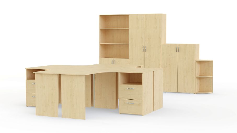 Офисный комплект Эконом BMS – не только простое и стильное, но и экономически выгодное решение для современного офиса. Лаконичный комплект включает в себя четыре угловых письменных стола с приставными тумбами, высокий и низкий двухдверные шкафы, комбинированный шкаф с открытыми полками и угловой стеллаж. Нейтральные тона под массив дерева легко вписать в любой интерьер. Купить офисный комплект Эконом BMS, подобрав необходимые параметры, вы сможете недорого в нашем интернет-магазин.