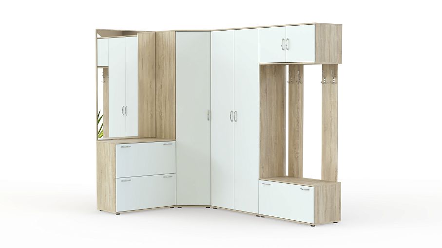Прихожая Севара 13 BMS привлекает внимание оригинальным современным дизайном и продуманной комбинацией модулей. Угловая композиция включает в себя распашные шкафы для одежды с полками и штангой, секцию с зеркалом и тумбой и открытую вешалку с распашной антресолью и обувницей. Эффектные матовые фасады модели износостойки, просты в уходе и надолго сохранят эстетичный вид. Купить прихожую Севара 13 BMS, которая поможет разместить большое количество вещей и украсит домашний интерьер, приглашаем в наш интернет-магазин.