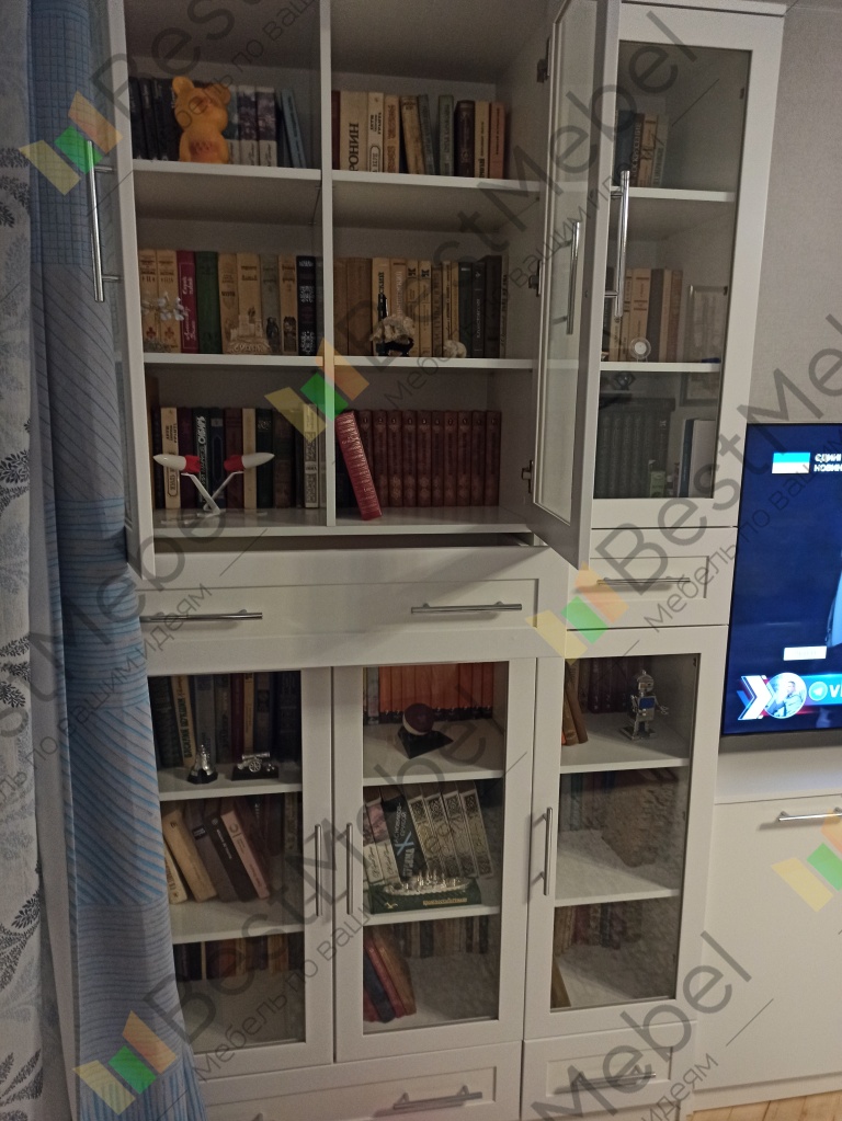 Отличный книжный шкаф. На полках разместилось около полутысячи книг, а в ящиках документы, фотоальбомы и прочие мелочи. Возможность выбрать размеры, конфигурацию и цвет сделал шкаф индивидуальным.