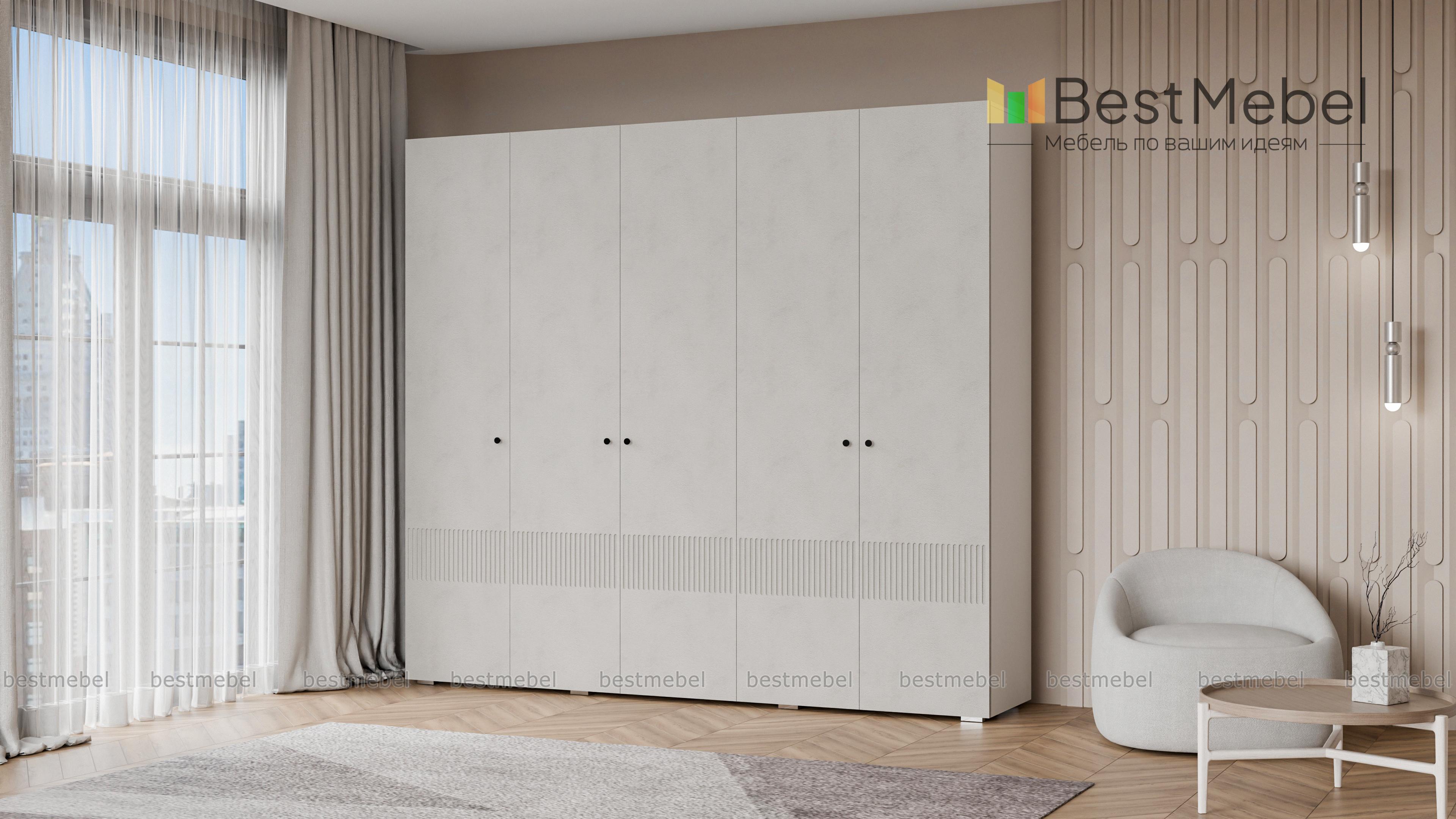 Шкаф распашной Джосс 5 BMS — это яркая современная модель с цветным фасадом и фрезеровкой. Комплектация с двумя штангами и полками подходит как для сложенной, так и развешанной на вешалках одежды, а также обуви и коробок с аксессуарами. С помощью этого пятидверного шкафа вы сможете удобно и эстетично организовать хранение гардероба для двух человек. Купить шкаф распашной Джосс 5 BMS с выбором размеров, цвета и фурнитуры приглашаем к нам в интернет-магазин.