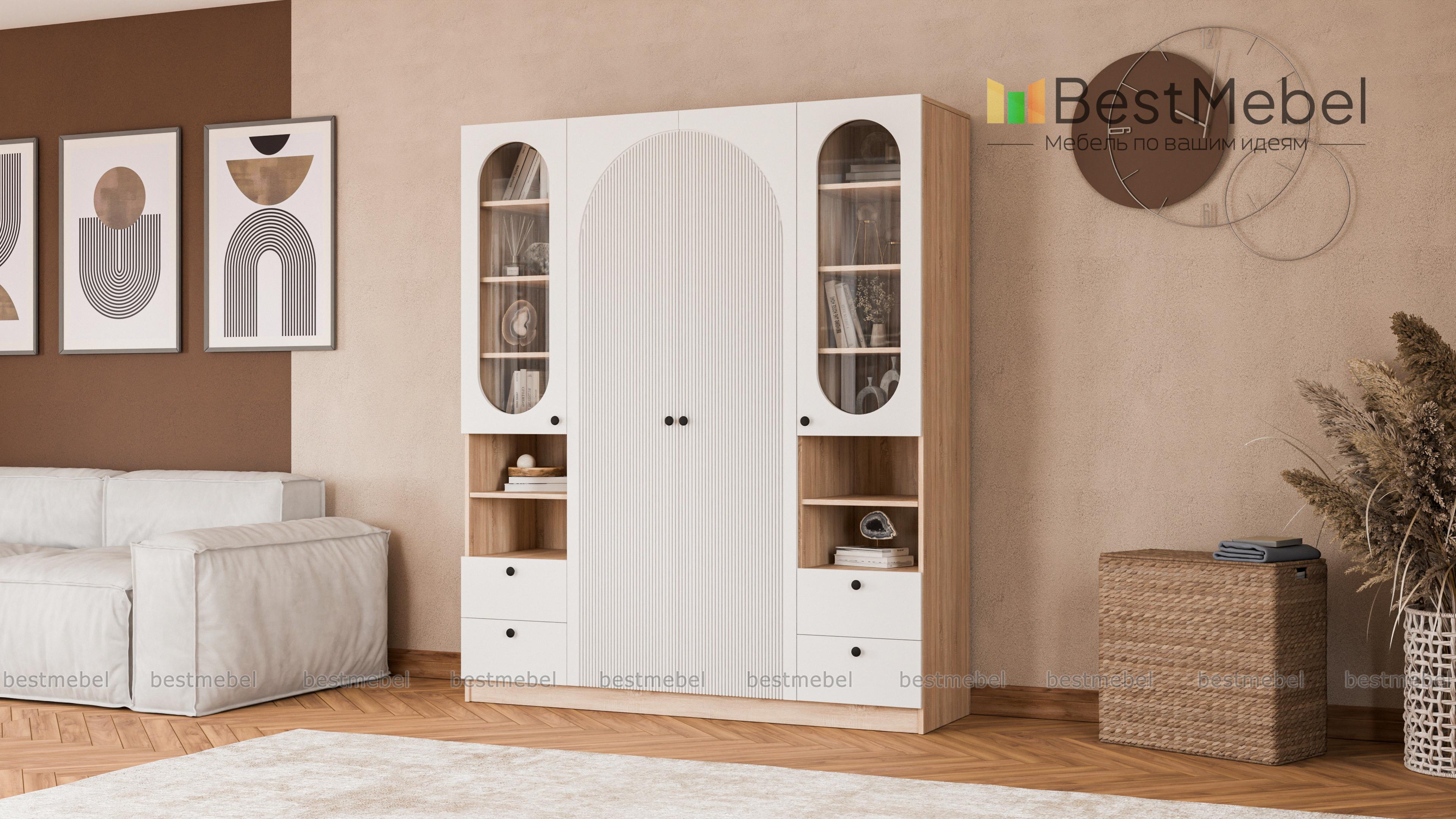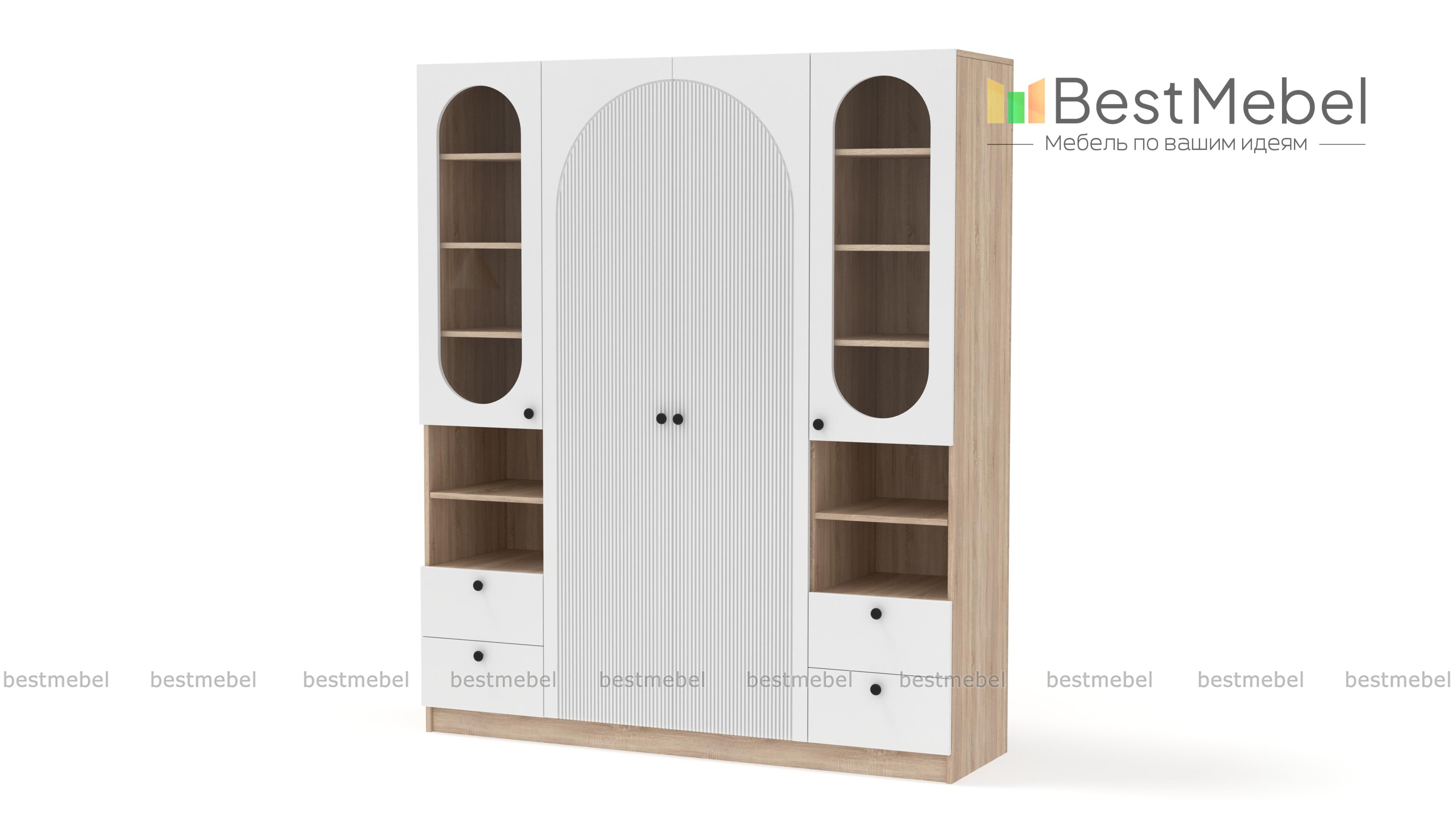 Шкаф распашной Вивьен 24 BMS дополнен двумя комбинированными секциями справа и слева. Система хранения с витринами, полками и ящиками позволяет разместить не только одежду и обувь, но и книги, интерьерные украшения, органайзеры с мелочами. Украшенный арочным вырезом, рельефом и овальными стеклянными вставками фасад выполнен в стильном темном оттенке из плиты МДФ. Купить шкаф распашной Вивьен 24 BMS вы сможете в нашем интернет-магазине с изготовлением по индивидуальным размерам.