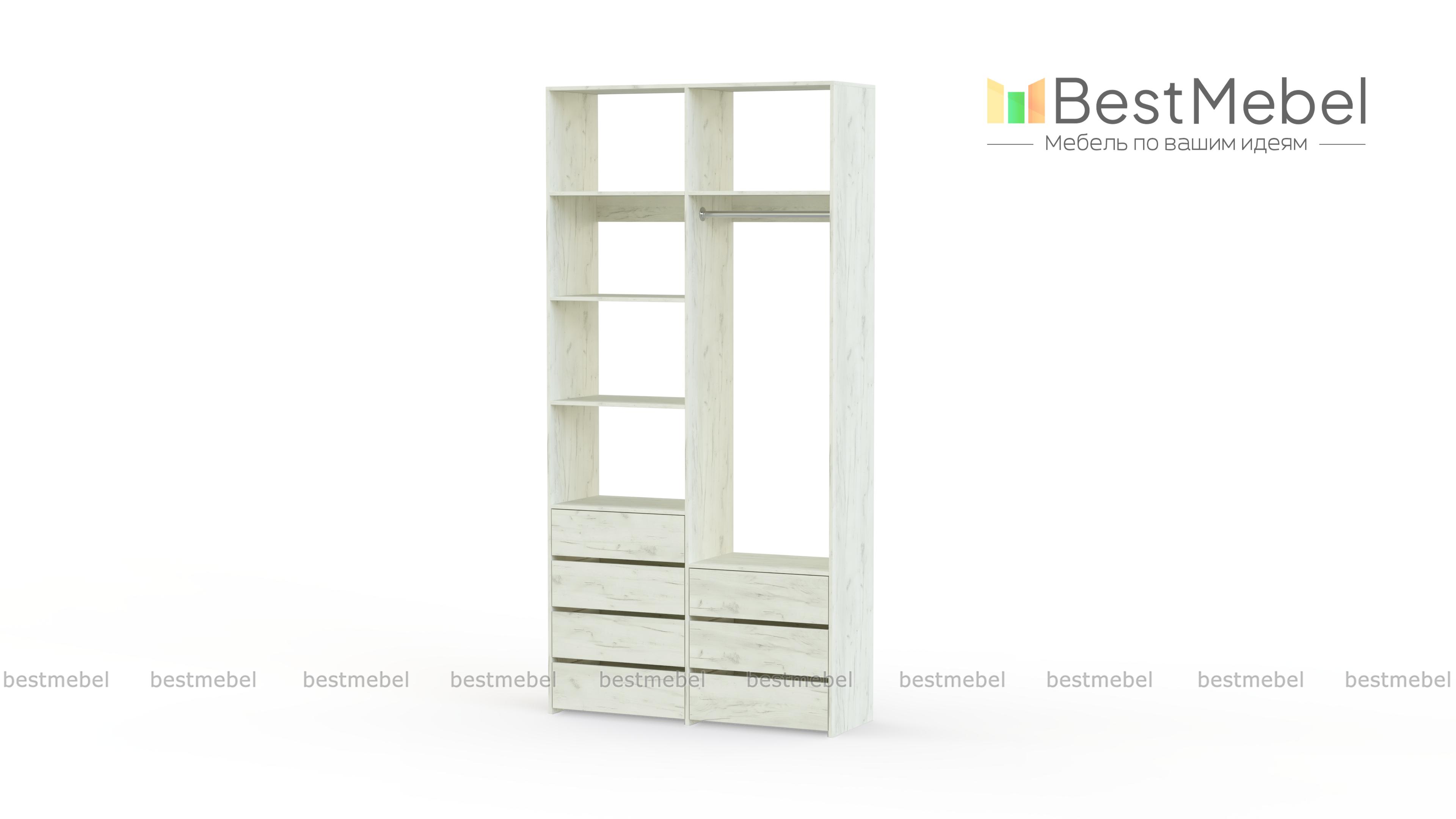 Стеллаж для одежды Мирта 41 BMS позволит вам зонировать пространство для хранения. Компактная двухсекционная конструкция разделена на отсек для вешалок, бельевые полки и два ряда выдвижных ящиков — под аксессуары, трикотаж и другие мелкие вещи. Для простого функционального дизайна стеллажа оптимально подходит светлый базовый оттенок. Купить стеллаж для одежды Мирта 41 BMS вы всегда сможете на сайте нашего интернет-магазина, по желанию изменив цвет и размеры.