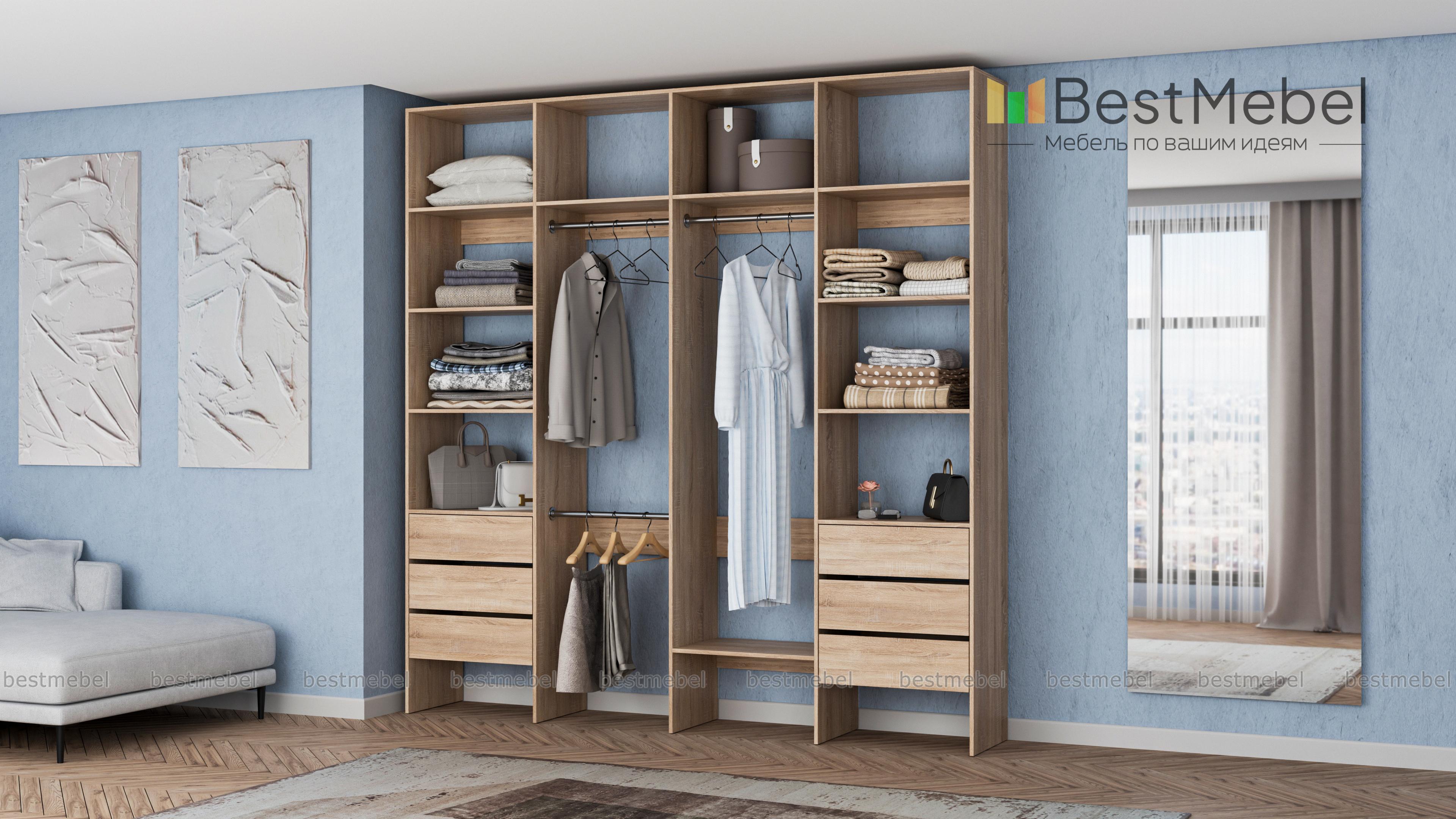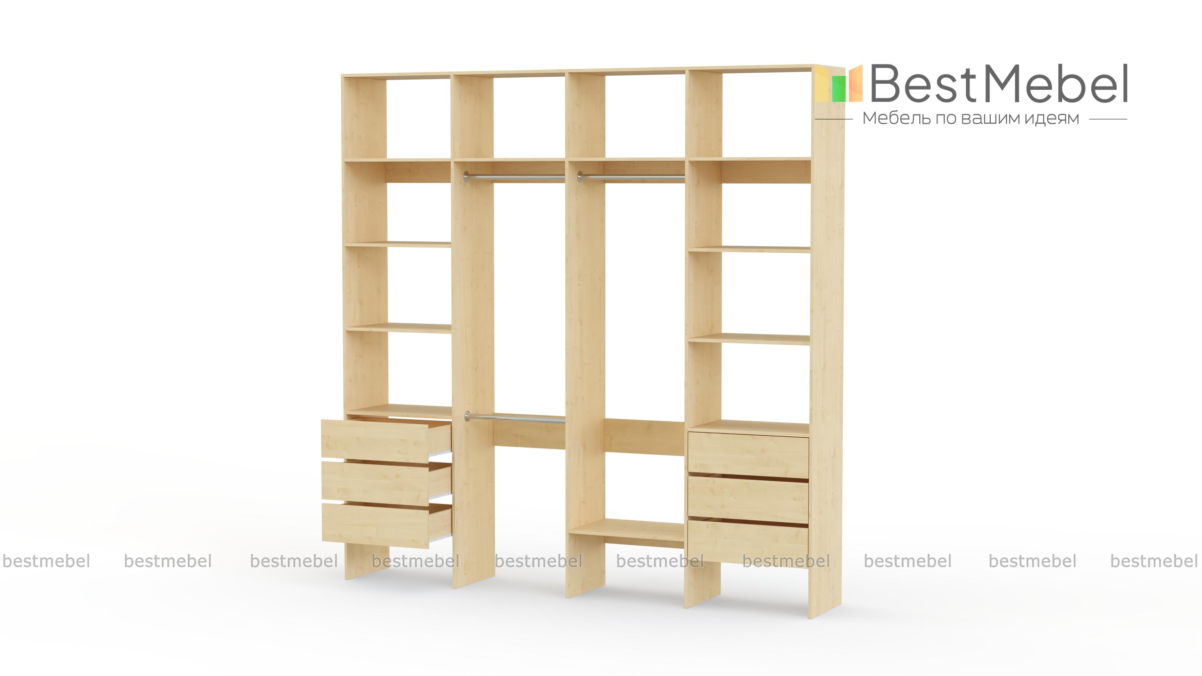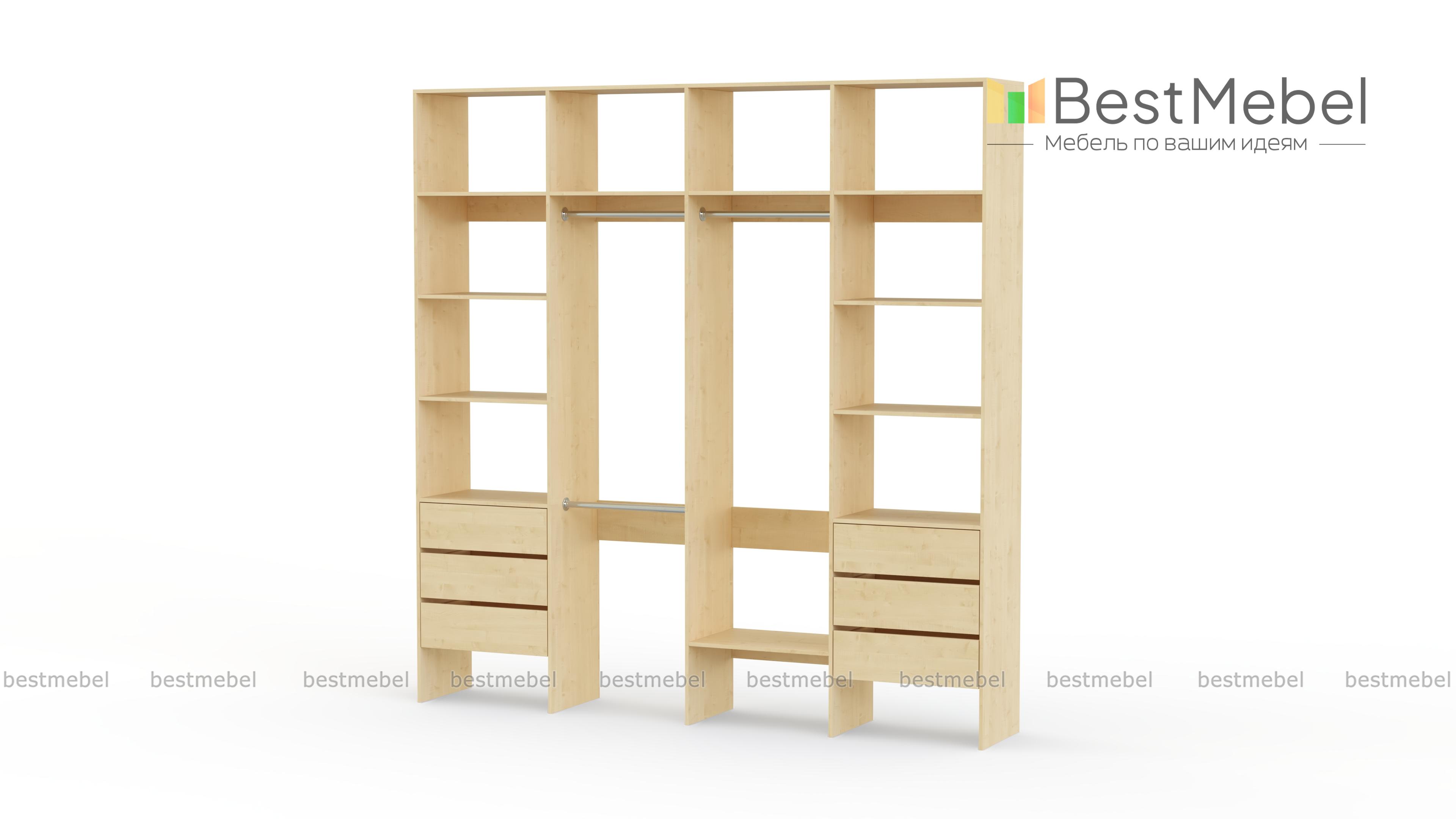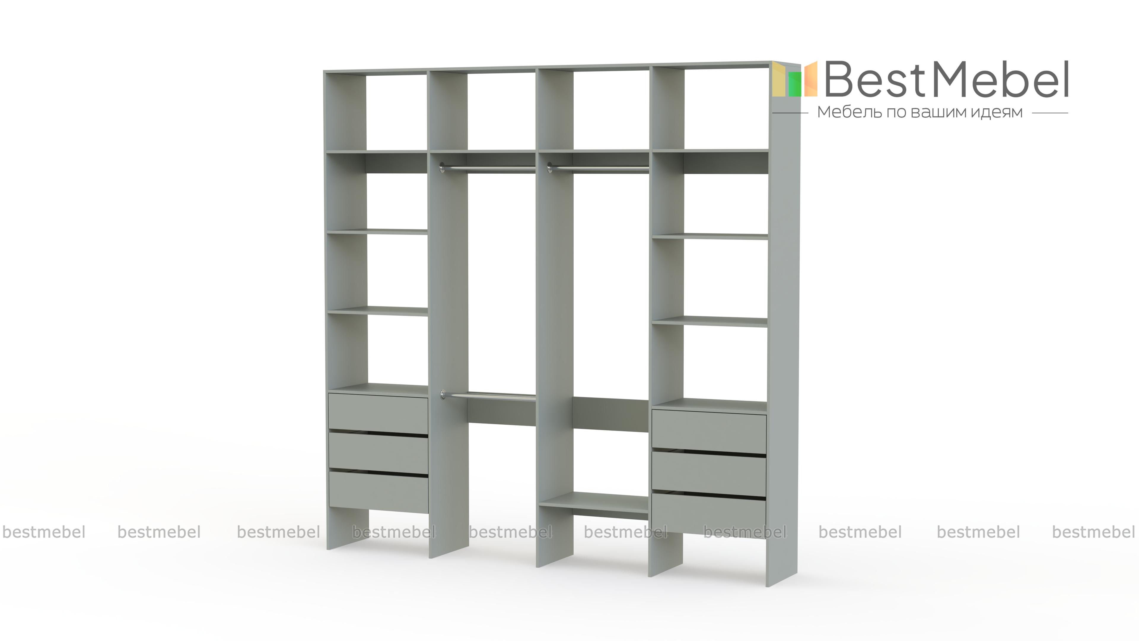 Стеллаж для одежды Мирта 65 BMS поможет легко сохранить порядок в гардеробной и входной зоне. Для компактного и аккуратного размещения вещей в стеллаже предусмотрены штанги, расположенные на двух уровнях, боковые и верхние полки, а также два ряда выдвижных ящиков. Качественная ламинированная ДСП гарантирует простоту ухода и долгий срок службы. Купить стеллаж для одежды Мирта 65 BMS, изготовленный по индивидуальным размерам, можно на сайте нашего интернет-магазина.
