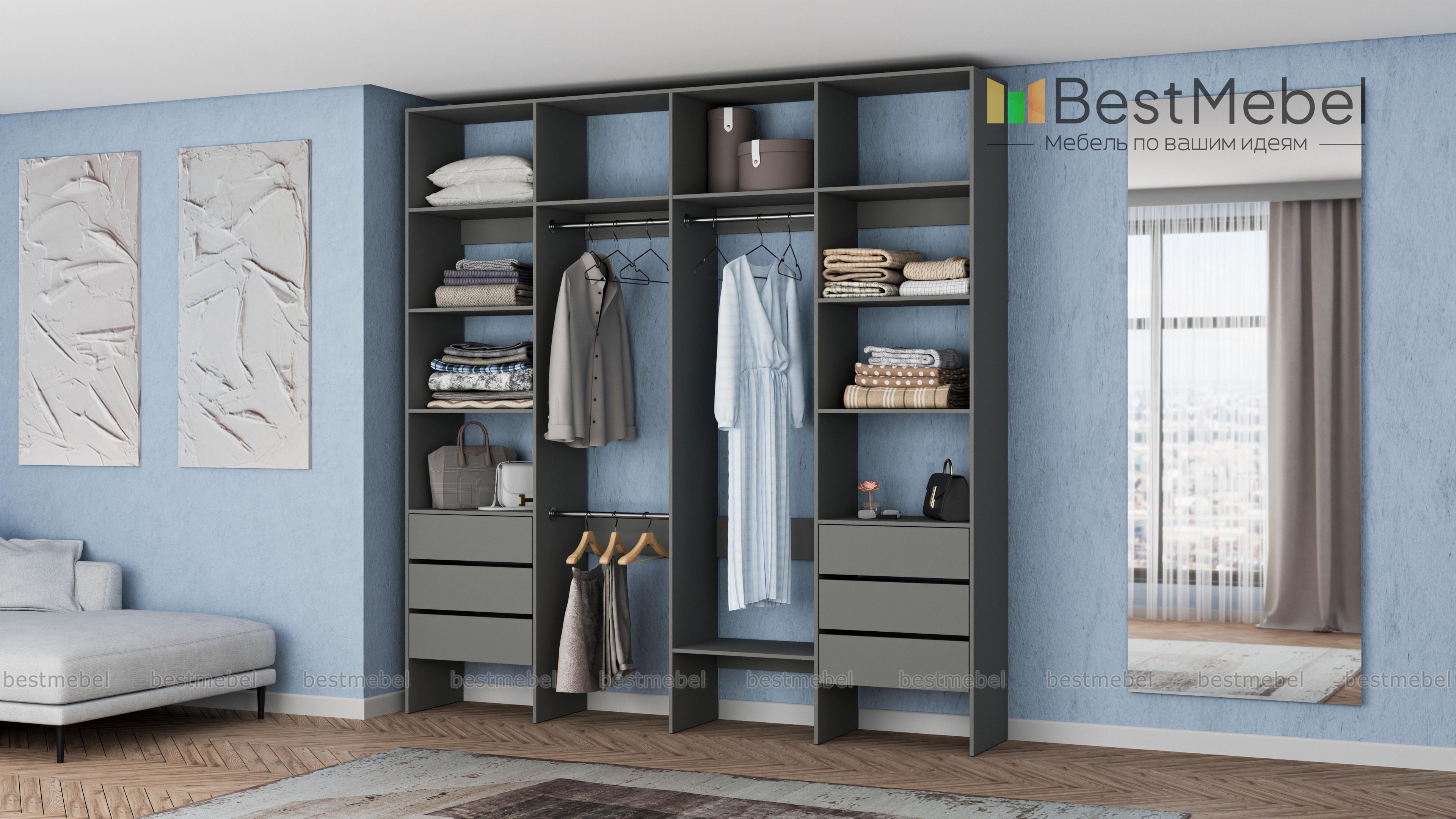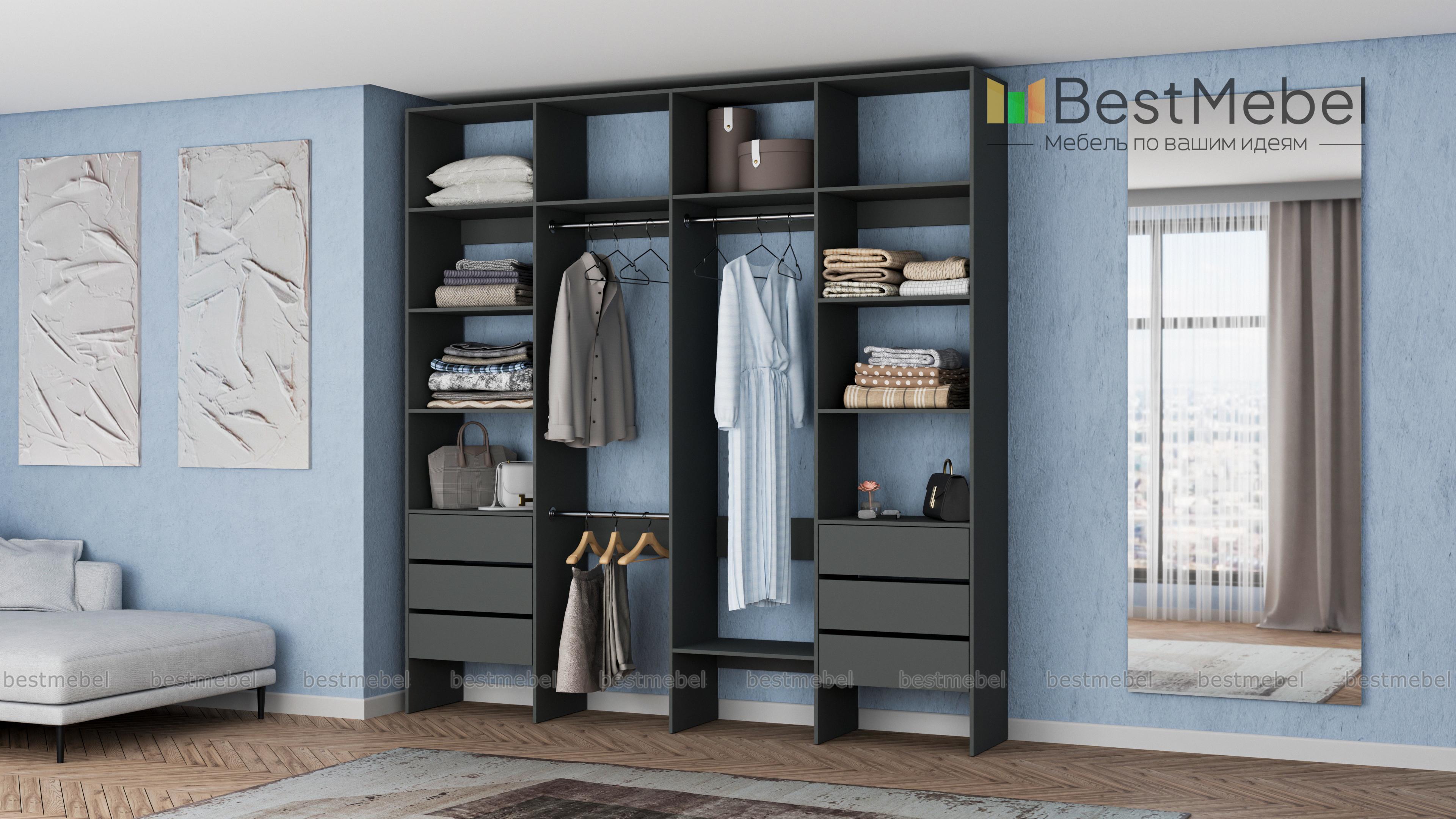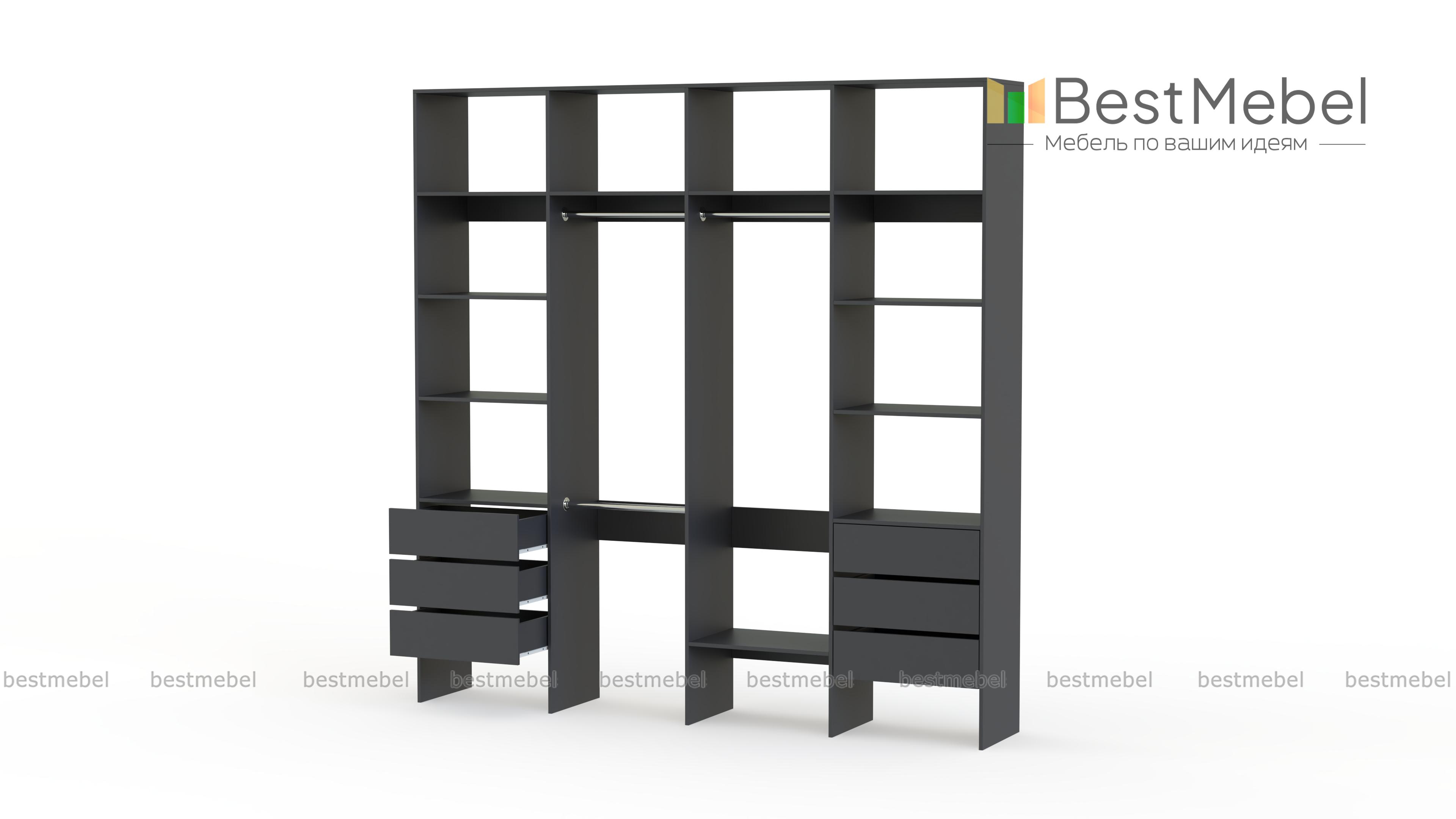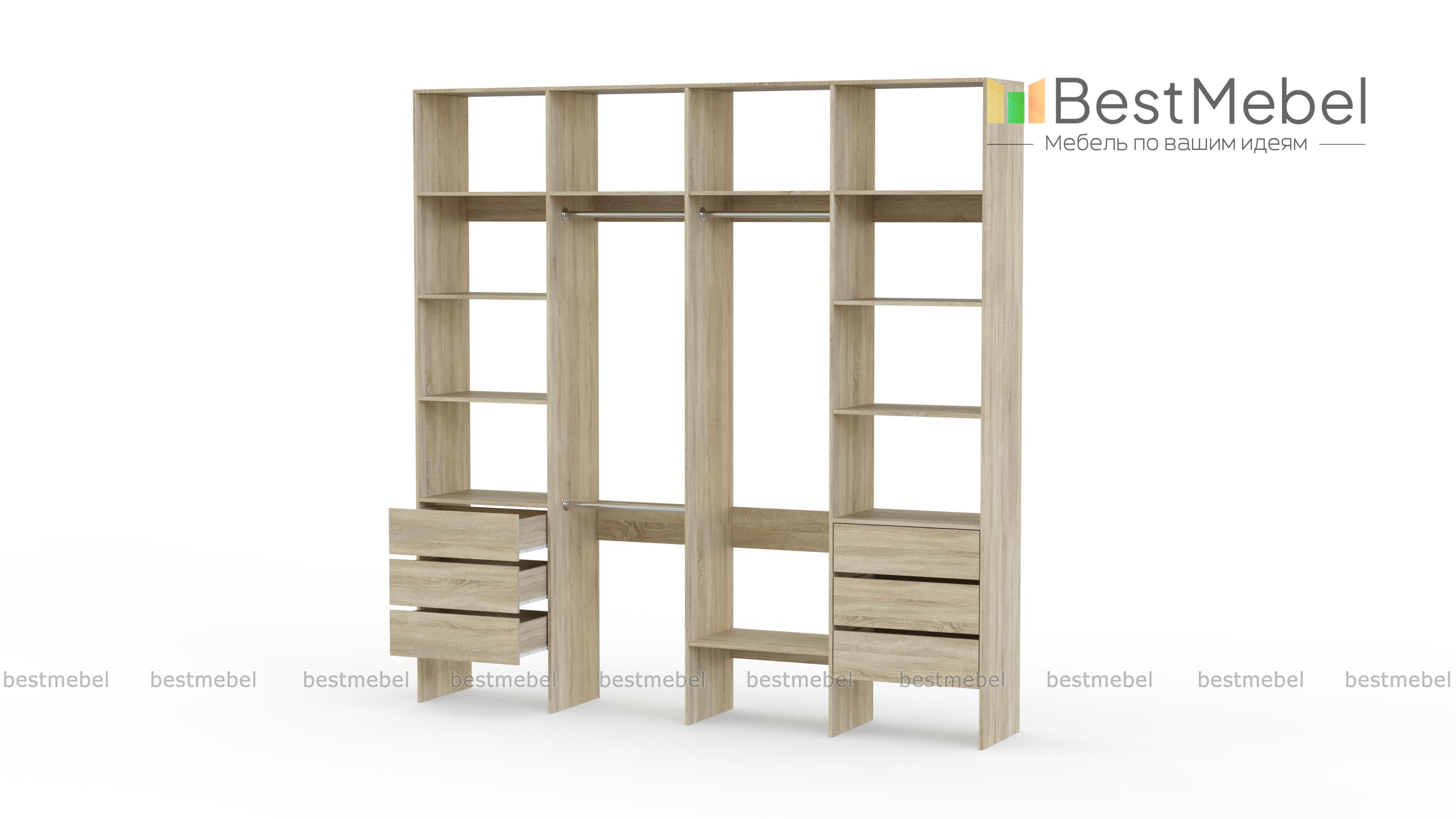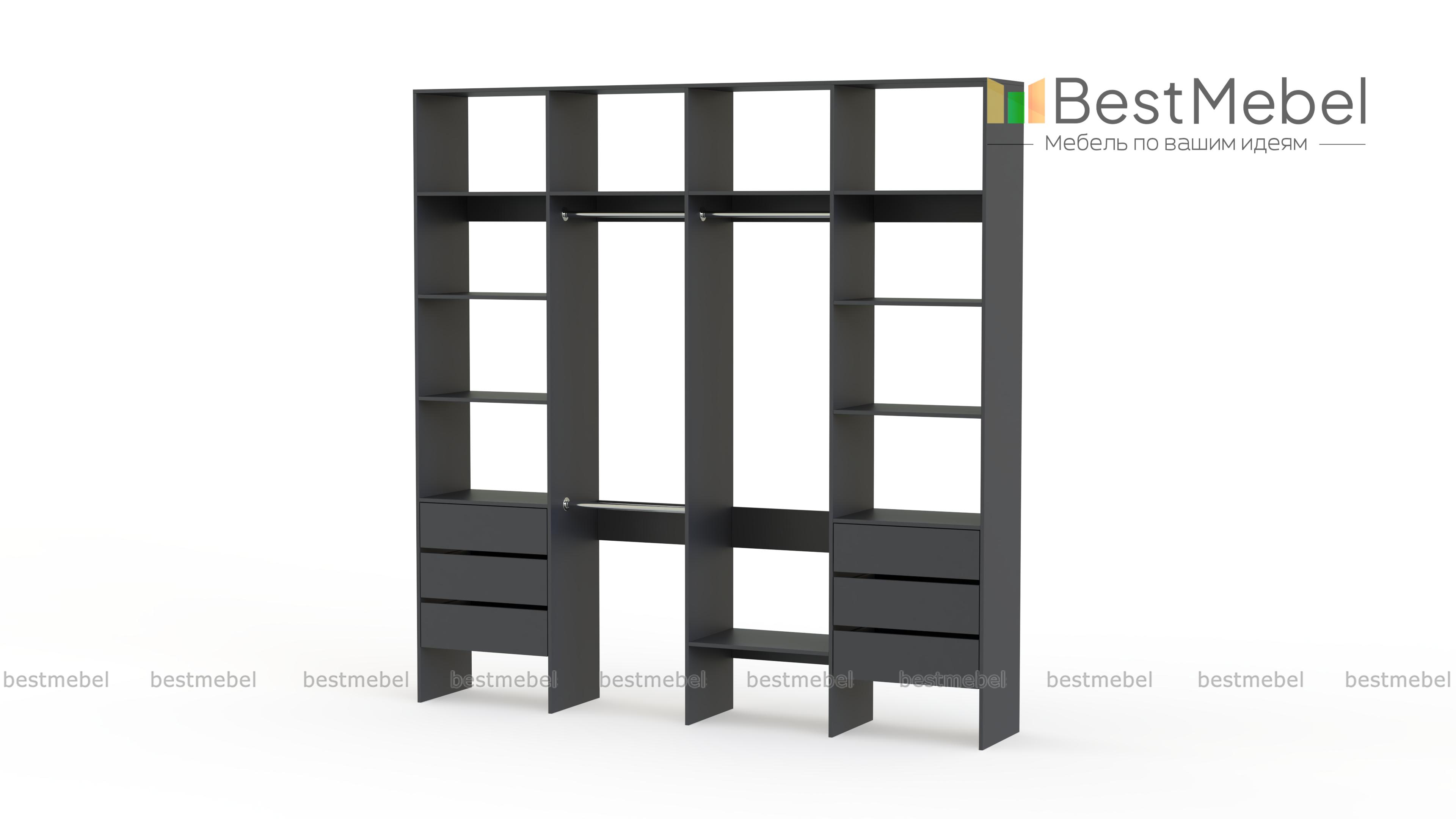 Стеллаж для одежды Мирта 65 BMS поможет легко сохранить порядок в гардеробной и входной зоне. Для компактного и аккуратного размещения вещей в стеллаже предусмотрены штанги, расположенные на двух уровнях, боковые и верхние полки, а также два ряда выдвижных ящиков. Качественная ламинированная ДСП гарантирует простоту ухода и долгий срок службы. Купить стеллаж для одежды Мирта 65 BMS, изготовленный по индивидуальным размерам, можно на сайте нашего интернет-магазина.