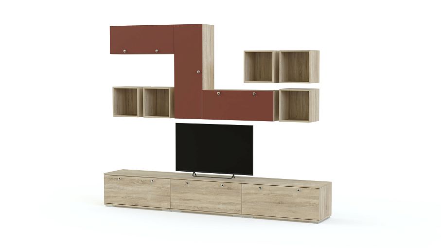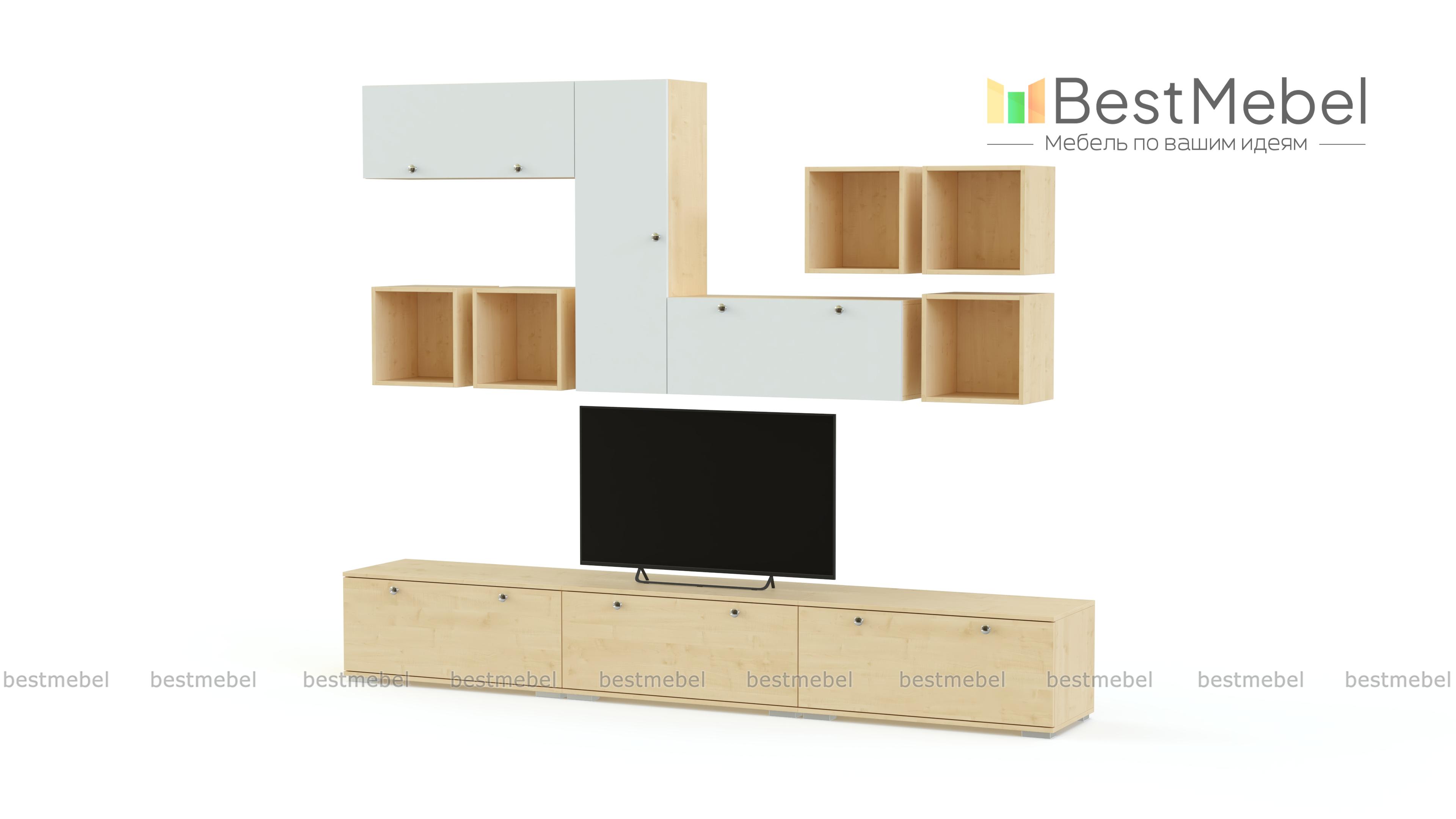 Глянцевая гостиная 7 BMS отличается модульной конструкцией, которая позволит создать индивидуальный вариант, учитывающий все особенности помещения. Строгие и лаконичные, модули системы выполнены в контрастном сочетании древесных тонов и цветного оттенка с хромированной фурнитурой. Низкие тумбы, навесные шкафчики с глухими фасадами и открытые полки позволят нестандартно оформить зону ТВ, разместить книги, интерьерные украшения и бытовые мелочи. Купить Глянцевую гостиную 7 BMS приглашаем недорого в наш интернет-магазин.
