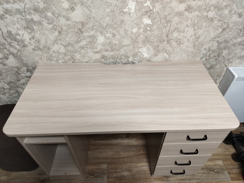 У стола не стандартные размеры, также были пожелания по отдельным элементам (один из которых вырез в задней части столешницы).Внешне очень понравился, хорошо вписался. Во качество на четверку, был небольшой скол в невидимой части стола и пара царапин с тыльной стороны - это не критично так как не видно. Так же в комплекте шли черные мебельные подпятники, хотя к такой расцветки - бежевые (может под цвет ручек ящика для контраста - не критично) Собирал сам, легко разобрался (есть электронный чертеж с описанием и номером детали) крепеж в полном комплекте.Хороший рабочий стол, по приемлемой цене. Спасибо!