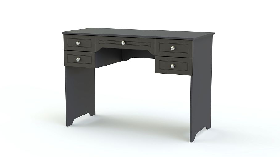 Туалетный столик Софья 2 BMS гармонично сочетает классические и современные черты. Выполненная в графитовых тонах, модель декорирована по фасаду рамочной фрезеровкой. Один большой и четыре малых выдвижных ящика помогут систематизировать хранение средств по уходу, аксессуаров, украшений и прочих мелочей. На широкой столешнице достаточно места для зеркала и предметов декора. Купить туалетный столик Софья 2 BMS для уютного спального интерьера приглашаем в наш интернет-магазин.