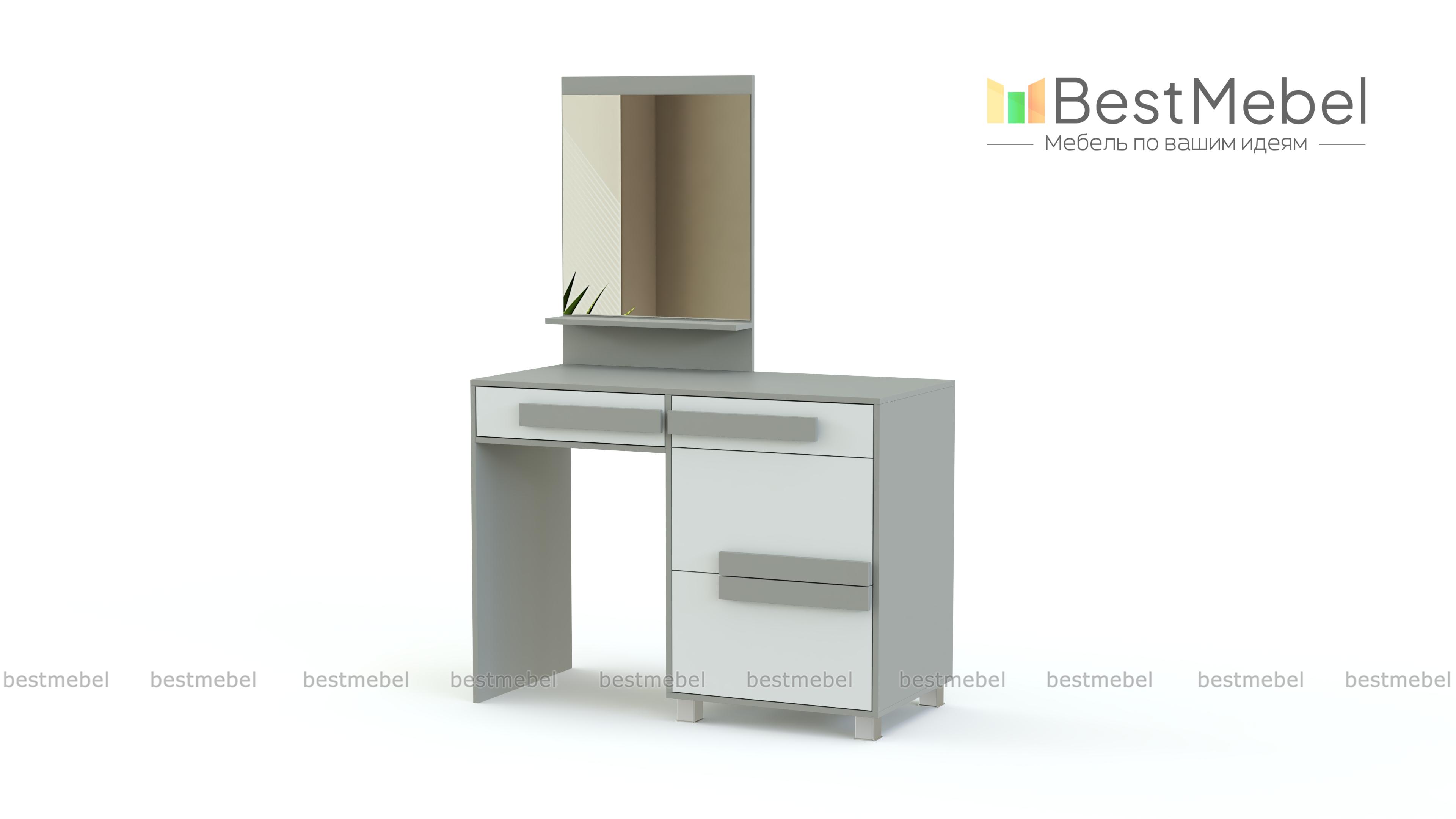 Туалетный столик СТ-5 Арт 155 BMS – стильный предмет интерьера для современной спальни. Закрепленное на столешнице зеркало дополнено узкой полочкой для мелочей. Также модель оснащена выдвижным ящиком и боковой тумбой для хранения уходовых средств и бумаг. Интересно смотрится этот простой функциональный столик за счет необычной отделки фасадов, модной цветовой гаммы и высоких ножек тумбы. Доступный по цене, туалетный столик СТ-5 Арт 155 BMS будет отличным приобретением для дополнения спального гарнитура или установки в прихожей.