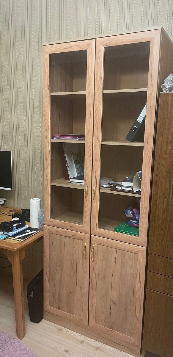 Хороший книжный шкаф. Сделали под мои размеры + выбрал дверцы с доводчиками и подрезку под плинтус, и еще ручки. Лучше собирать в конструкторе, чтобы не упустить детали изделия. Изготовление и доставка до Беларуси +/- 3 недели, собрать шкаф можно самому. Пару дней пах ДСП или краской, или еще чем-то таким, потом проветрился и сейчас все нормально. Заказ:№ 1229910.