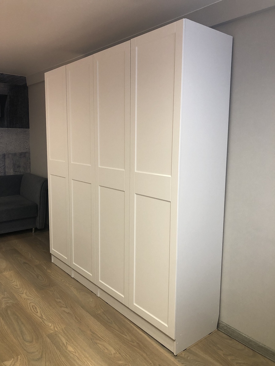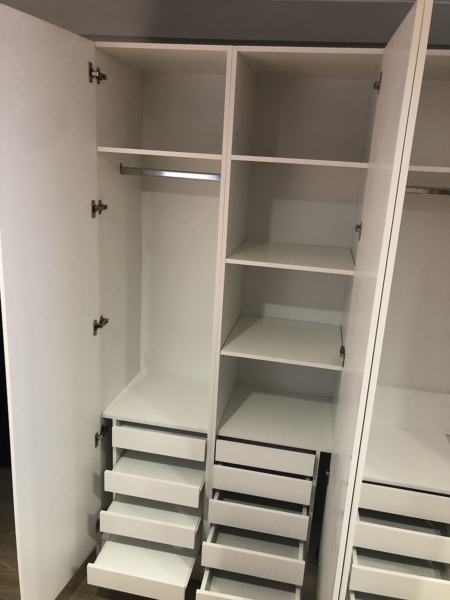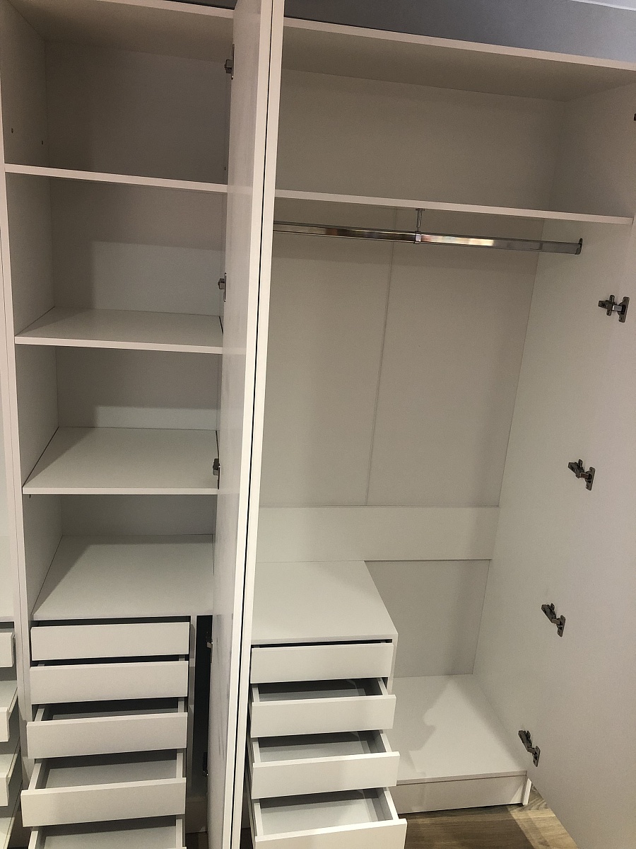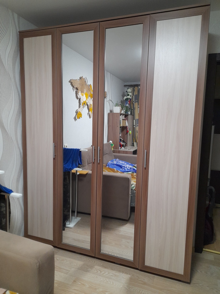 Хороший шкаф. Вместительный. При составлении заказа шкаф был без ножек, но привезли шкаф с ножками и вариант с ножками больше понравился. В отделениях со штангами, добавила ещё по одной штанге. На дверях зеркало не приклеено, сама дверь из зеркала, неожиданно было. Так что, если зеркало вдруг разобьется, будет дыра. Для бюджетного варианта качество хорошее.